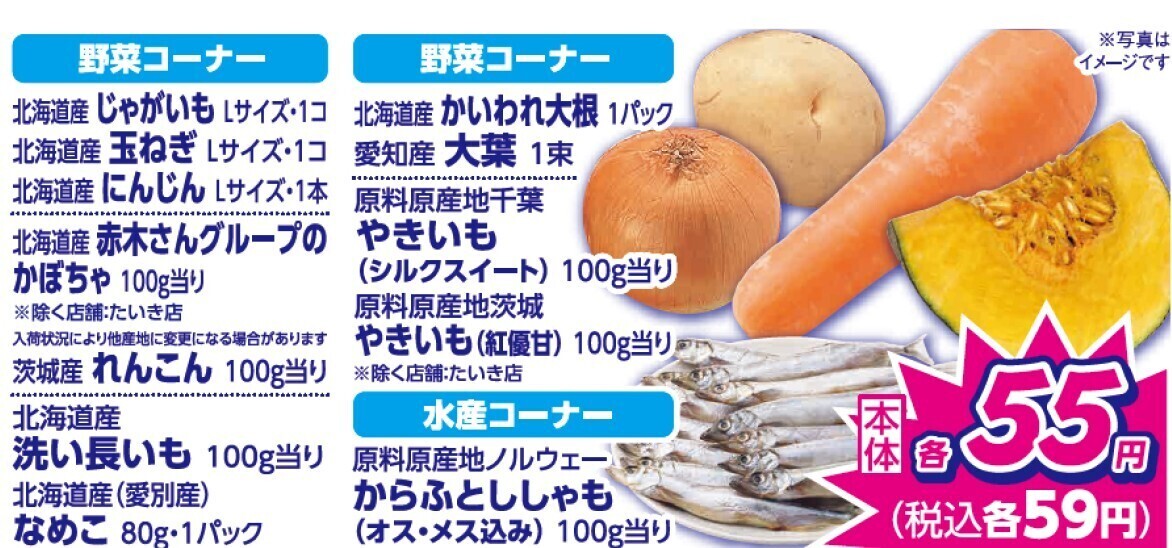 見逃し現金の超特価品が盛りだくさん!本体55円均一や増量パックなど、日々の暮らしに嬉しい商品が勢ぞろいです!