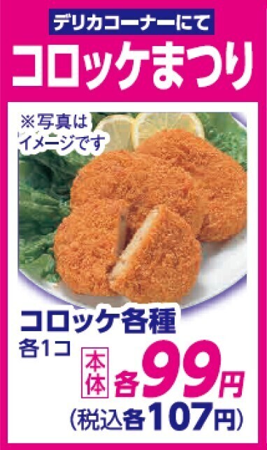 デリカコーナーでは恒例のコロッケを各種税込107円均一開催します。