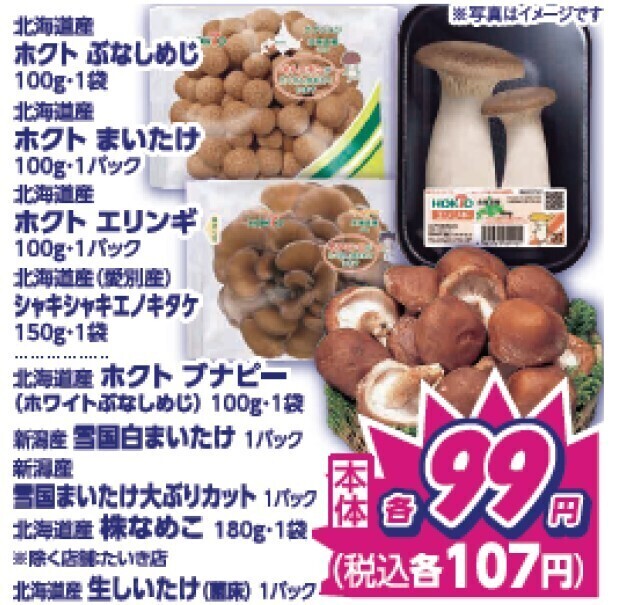 ホクトのきのこや生しいたけなどがなんと1袋・1パック税込107円均一です!