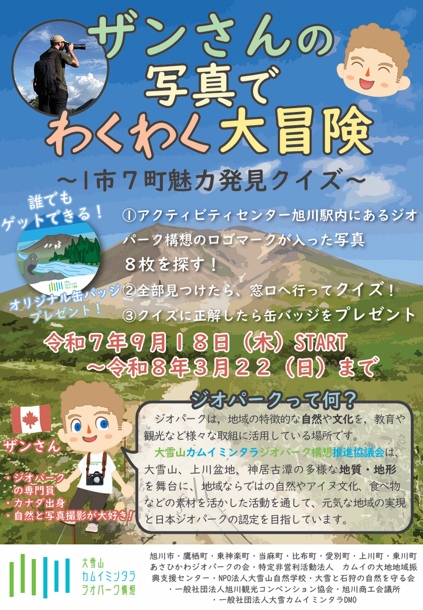 2025年9月18日(木)から2026年3月22日(日)までアクティビティセンター旭川駅で『ザンさんの写真でわくわく大冒険~1市7町魅力発見クイズ~』が開催されています。