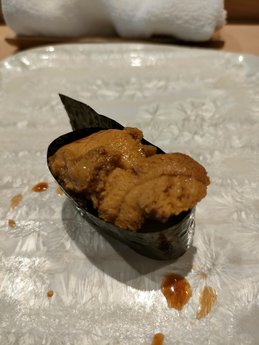 この日はヒラメ・中とろ・ホッキ・ボタンエビ(羽幌産)・シマアジ・ズワイガニ・ホタテ(留萌産)・ムラサキウニ(礼文産)・出汁巻き玉子・穴子の10貫でした。