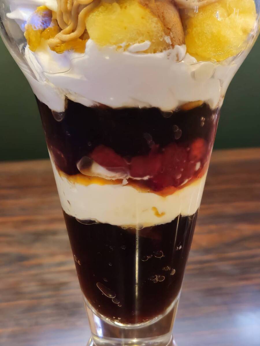 台湾カステラ、コーンフレーク、ホイップクリーム、ミックスベリー、マスカルポーネクリーム、コーヒーゼリーと、食感も味わいもいろいろ。