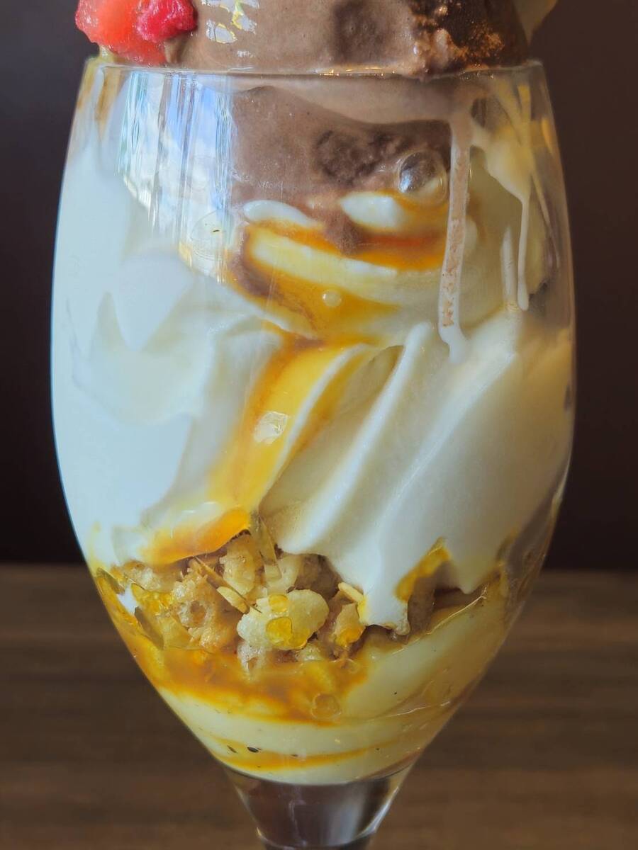 下にはソフトクリーム、キャラメルソース、フレーク、カスタード。
