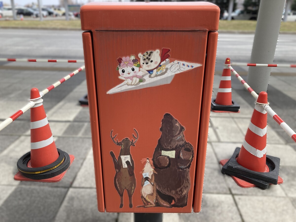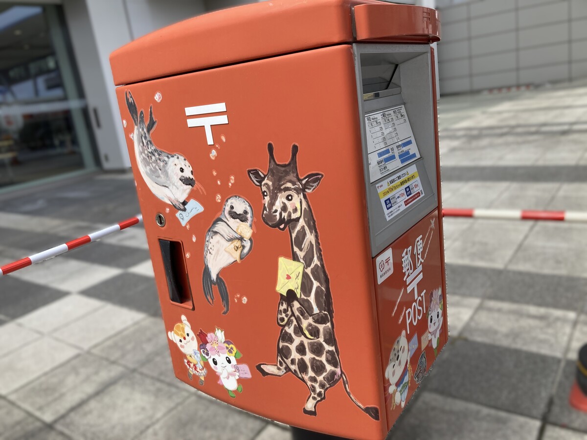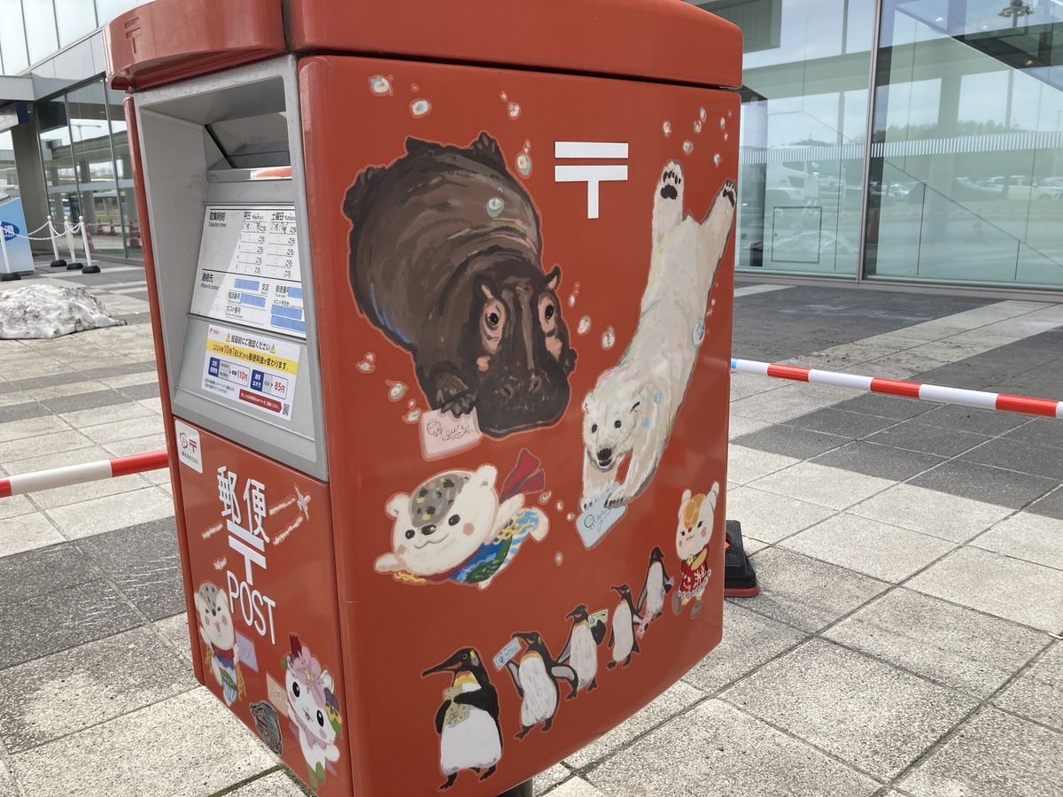 実はこれ、旭川市の人気観光地「旭山動物園」の動物たちと、ご当地キャラたちがコラボした特別なポストなんです。旭川の「あさっぴー」と「ゆっきりん」、東神楽町の「かぐらっき~」などのキャラクターに加え、カバ、ホッキョクグマ、ペンギン、キリン、キタキツネなど、かわいらしいイラストがポスト全体をぐるっと囲んでいます。