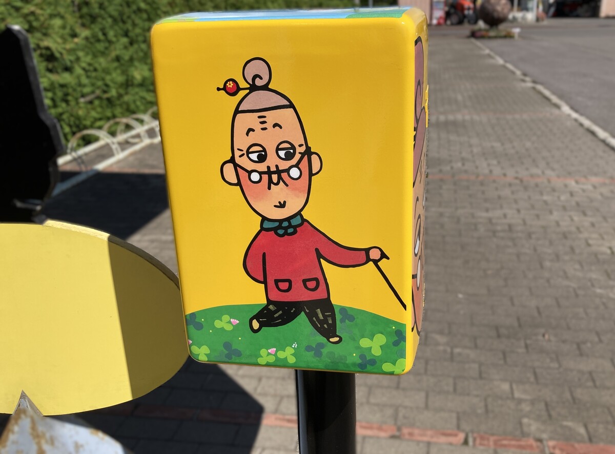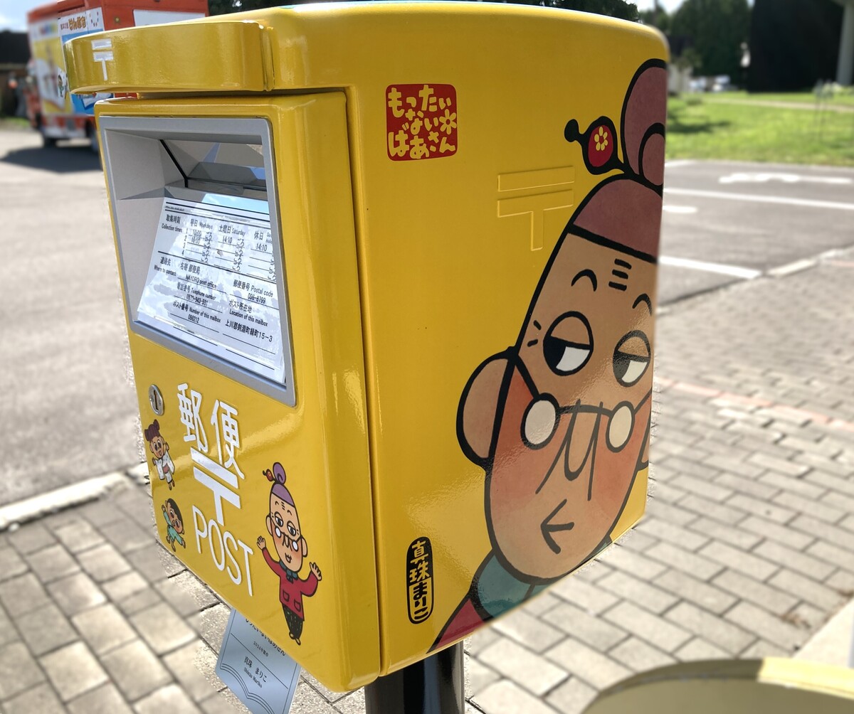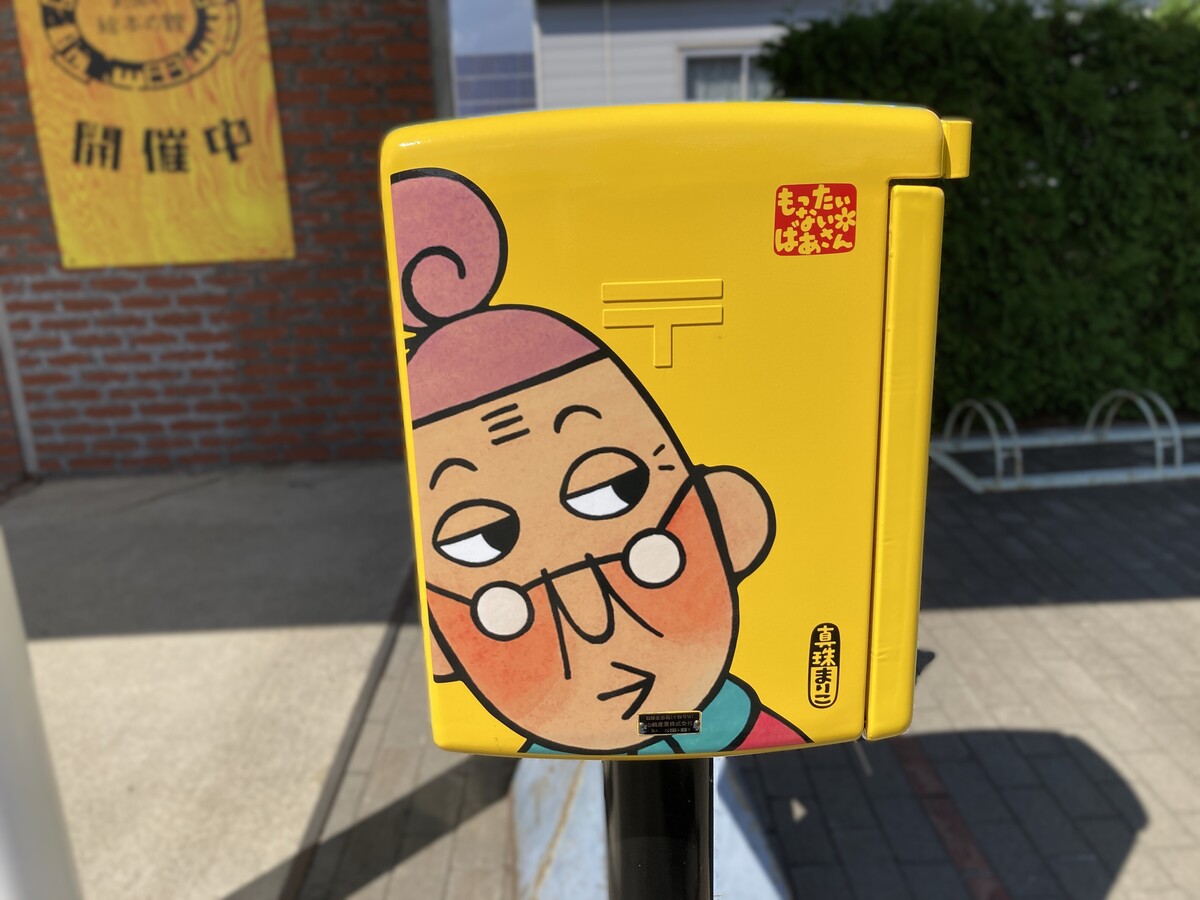 この明るい黄色のポストは、絵本作家・真珠まりこさんの代表作『もったいないばあさん』のイラストで装飾されていて、遠くからでもひときわ目を引きます。