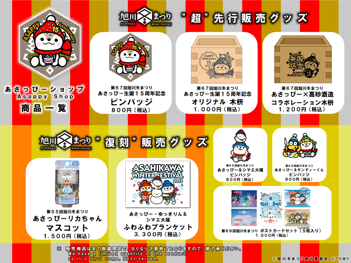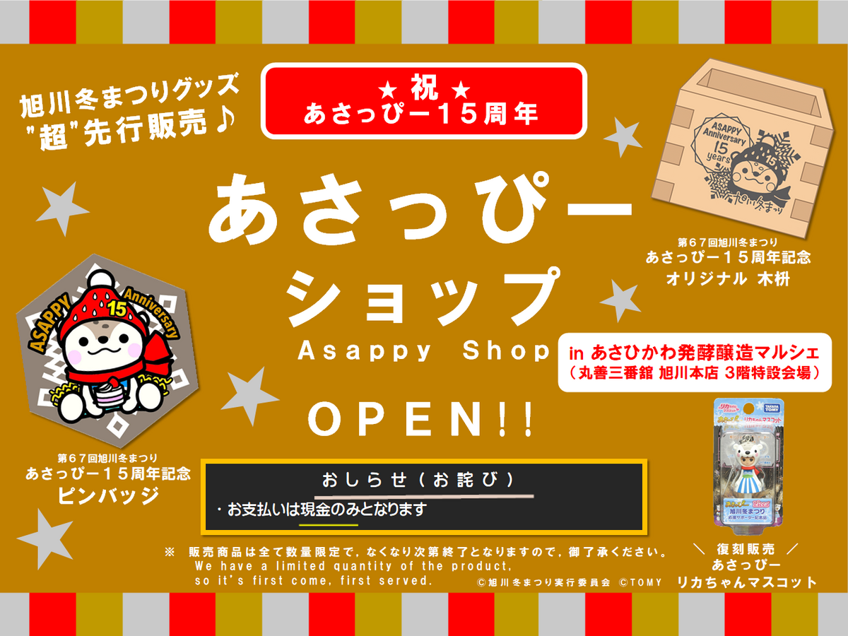 会場では、あさっぴーの生誕15周年を祝う旭川冬まつり公式グッズを超先行販売する”あさっぴーショップ”も登場!