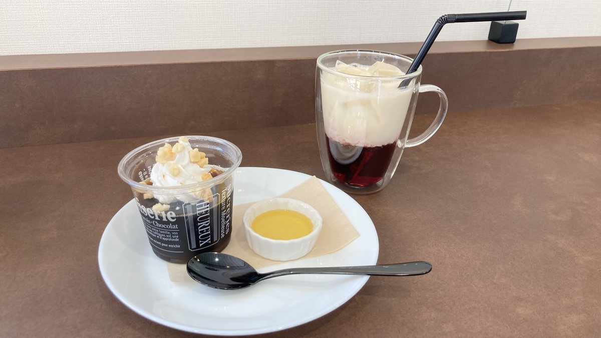 この日は、「ざくろラテ(税込500円)」と「だいだいの丘風コーヒーゼリー はちみつ添え(税込350円)」をいただきました。