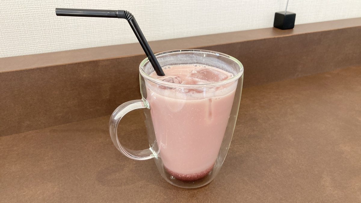 ざくろラテは甘酸っぱくてさわやか。混ぜると、ほんのりチーズのような風味も感じられてとっても体によさそうなドリンクでした。