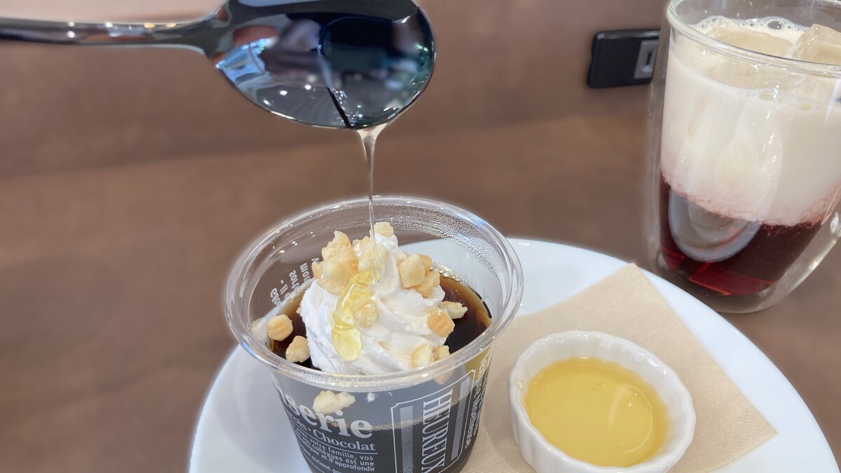 コーヒーゼリーはしっかりした苦味があり、たっぷりのはちみつが絶妙に合います。サクサクのトッピングも良いアクセント。