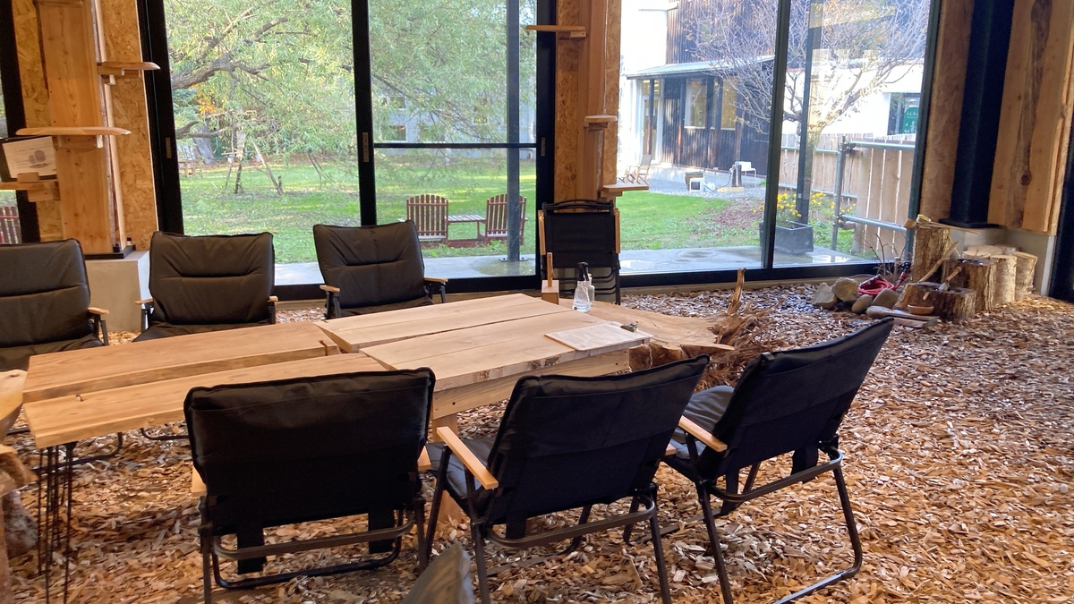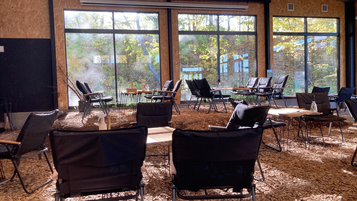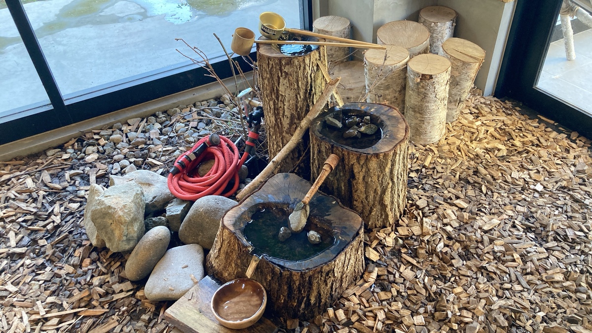 店内に入ると、ウッドチップが敷かれた床と、ペット用の水飲み場があり、ナチュラルであたたかな空間が広がっています。大きな窓の外には緑が広がり、まるで森の中にいるような心地よさ。