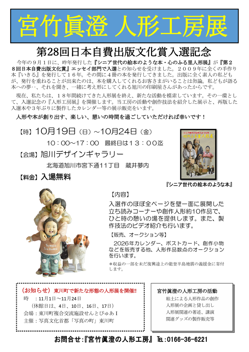 2025年10月19日(日)から24日(金)まで旭川デザインギャラリーで『宮竹眞澄 人形工房展』が開催されます。