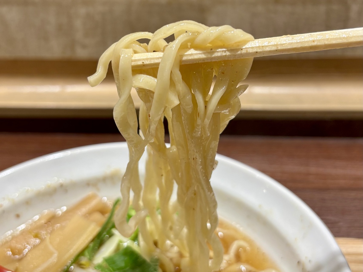 平打ちの縮れ麺とあご出汁スープが特徴の中華そば。