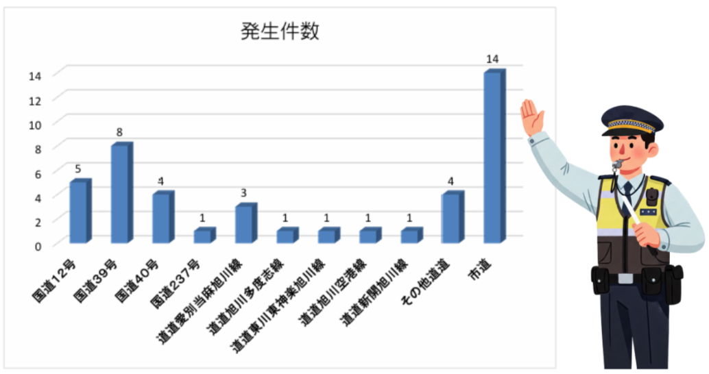 国道では、国道39号が8件と多く、道道では愛別当麻旭川線での発生が多くなっています。