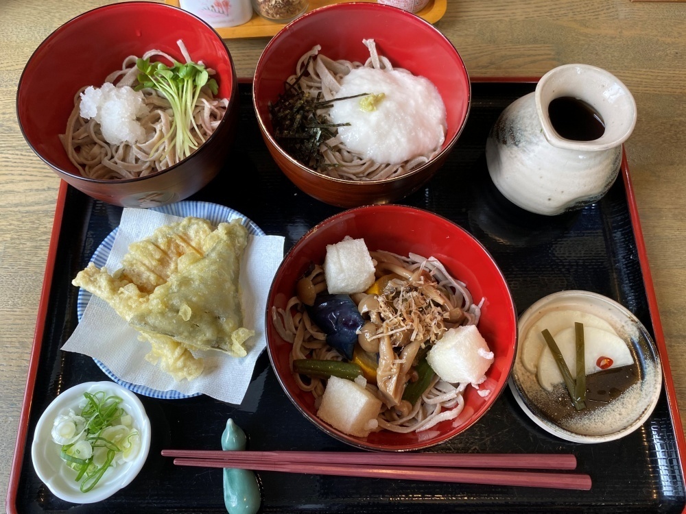 「わんこそば」は、小さなお椀に入ったそばを好きなだけお代わりしてたべる岩手県の郷土料理ですが、「手打蕎麦処 蕎麦切 左膳」の「わんこ三昧」はとろろ芋、大根おろし・お餅と茄子の揚げびたしという異なるおそばが3つのお椀に入っています。