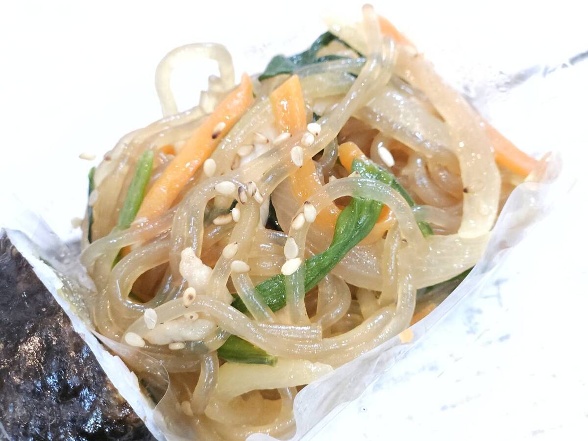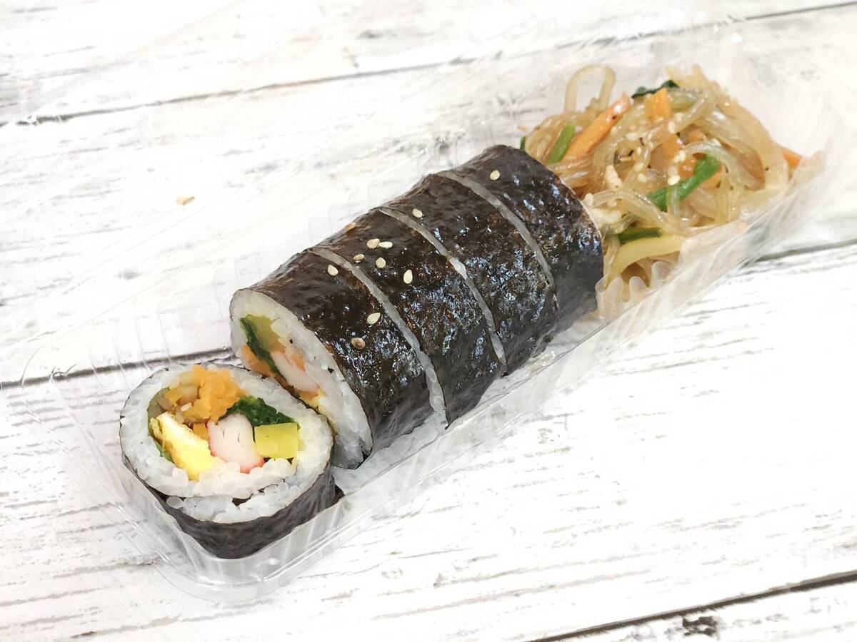 キンパとおかずのセットで、おかずはチャプチェ、チヂミ、ヤンニョムチキンなどから選べます。