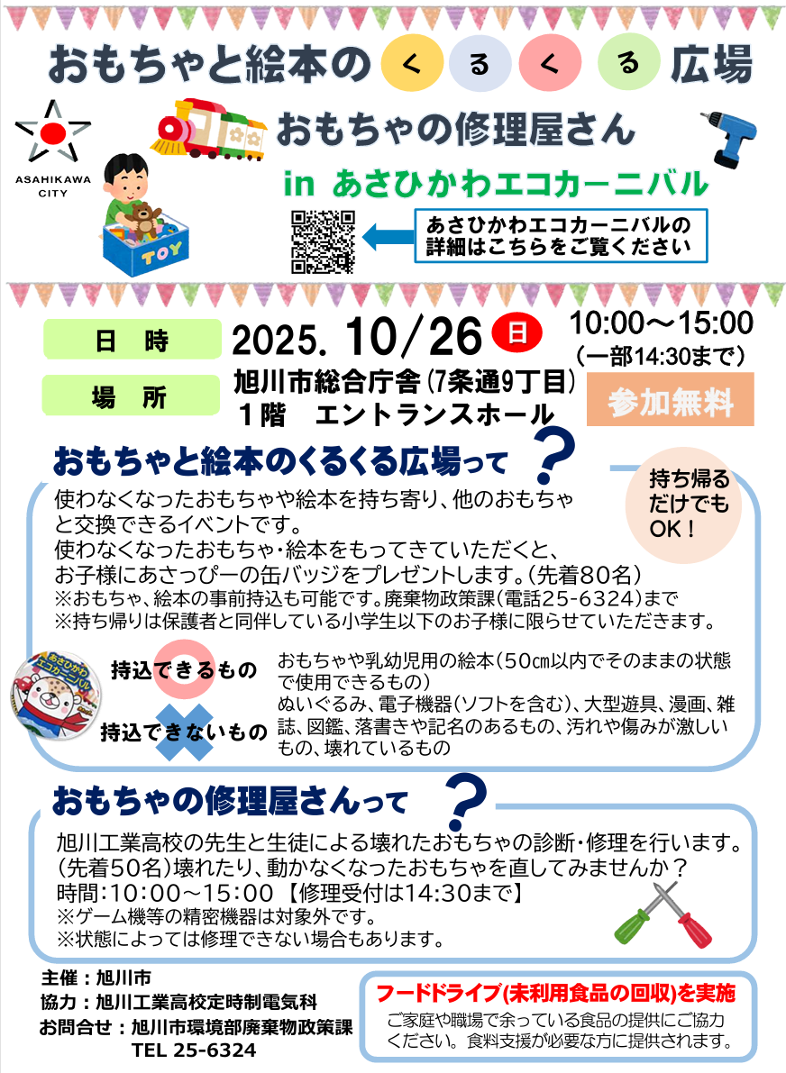 2025年10月26日(日)に旭川市総合庁舎で『おもちゃと絵本のくるくる広場 おもちゃの修理屋さんinあさひかわエコカーニバル』が開催されます。