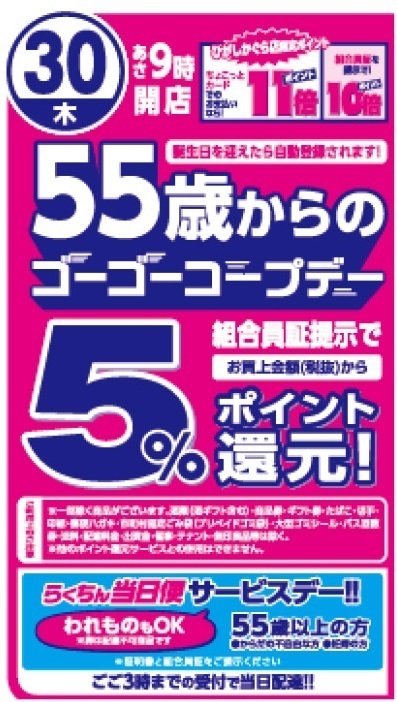 55歳以上の組合員さんは、手続き不要、自動的に組合員証提示でお買上金額(税抜)から5%ポイント還元!