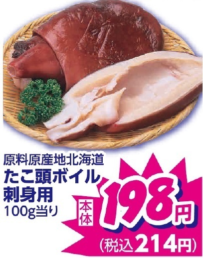 たこ頭ボイル刺身用100g当り税込214円!