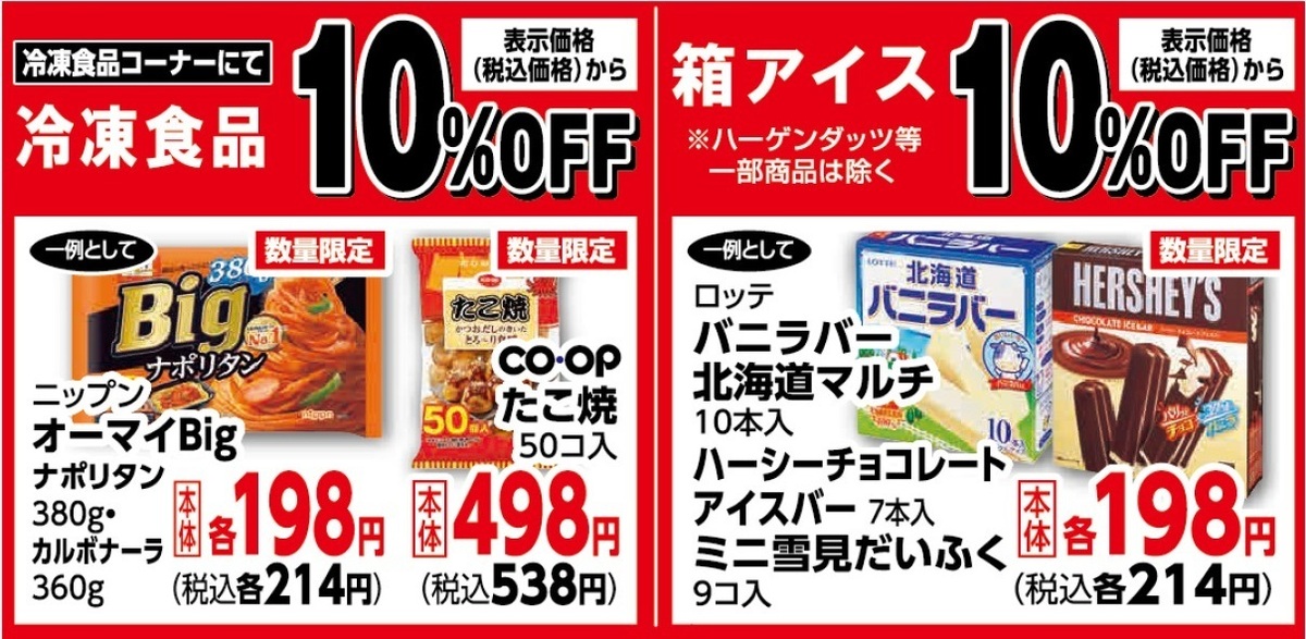 冷凍食品に箱アイスがいずれも店頭表示価格(税込価格)より10%OFFです!