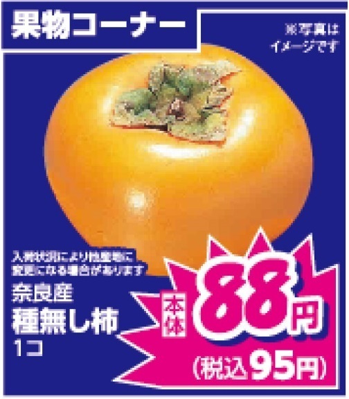 果物コーナーからは、まず、甘くて食べやすいと人気の奈良県産種無し柿がなんと1個税込95円!