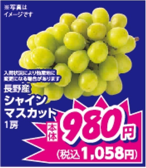さらに、高級フルーツの代表格である長野県産シャインマスカットも、1房税込1,058円OPEN特別価格!