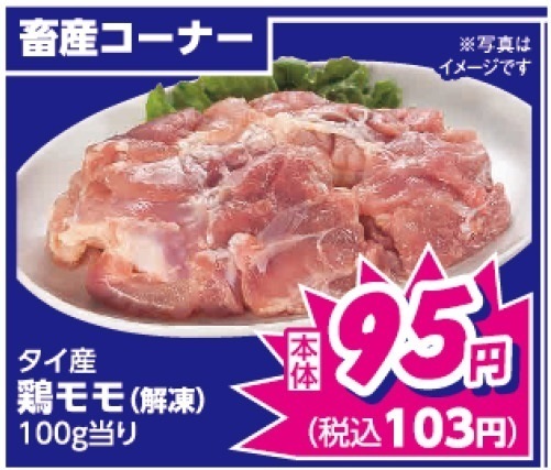 そして、畜産コーナーからは、使い勝手の良いタイ産鶏もも肉(解凍)が100g当り税込103円!