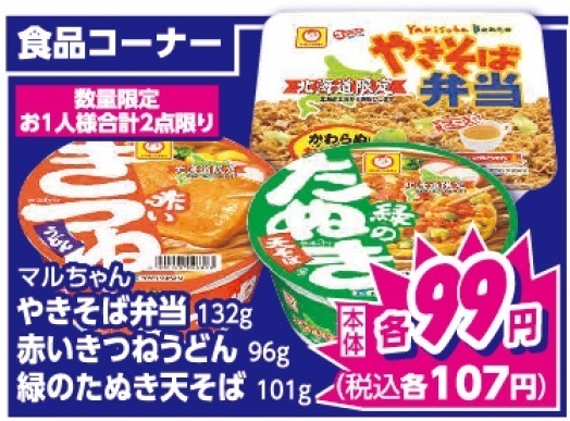 手軽なランチや夜食に便利なマルちゃんの『やきそば弁当』『赤いきつねうどん』『緑のたぬき天そば』各種が、数量限定でお1人様合計2点限り税込107円!