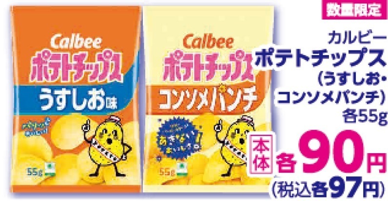 おやつに欠かせない『カルビー ポテトチップス(うすしお味・コンソメパンチ)』も数量限定で各55gが税込97円です!