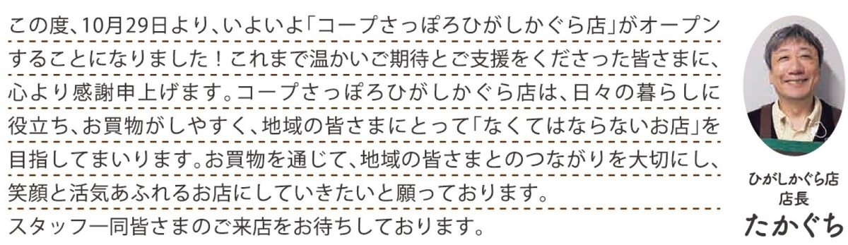 日々の暮らしに役立ち、お買い物が楽しくなる、そんなひがしかぐら店をどうぞよろしくお願いします。