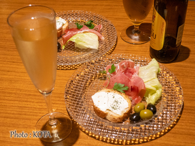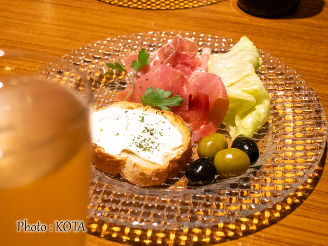 画像上 / それほど待たされることもなくすっと出てきた、これがメニューに記されていた『生ハム含むおつまみ3点盛り』。