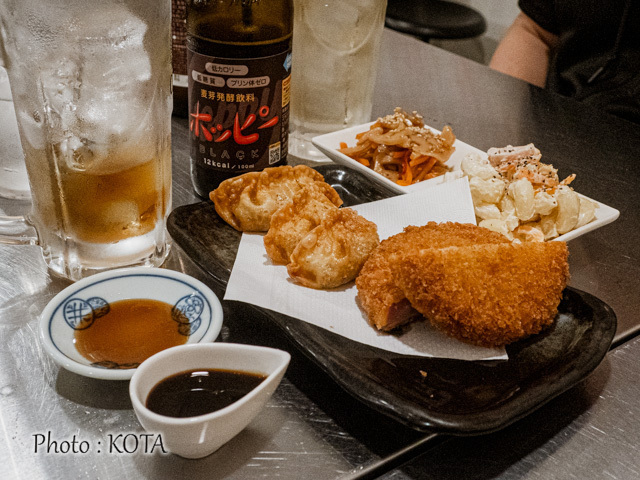 ドリンクはホッピーを。おつまみ、手前の皿は筆者(揚げ物好き)が選んだ揚げ餃子とハムカツ。