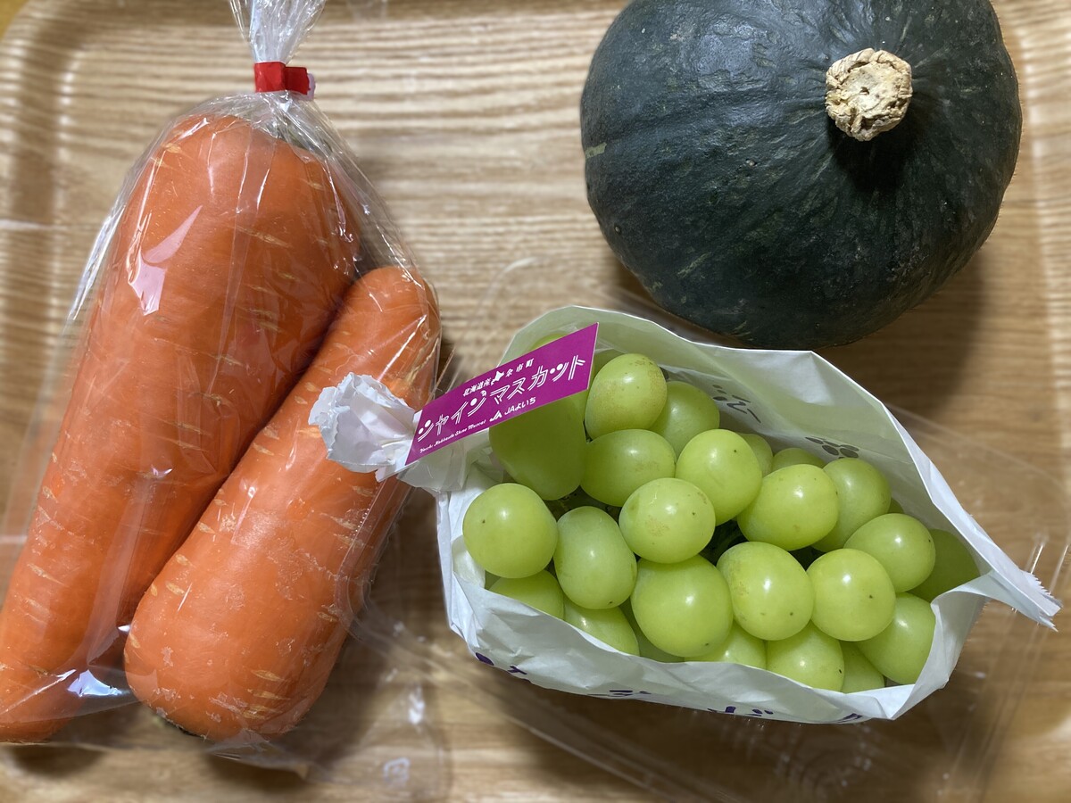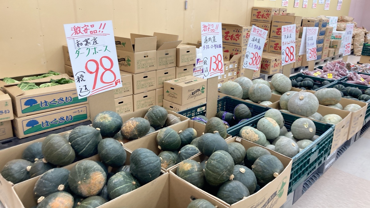 他に購入した、和寒産のかぼちゃ「ダークホース」は(税込98円)、500mlペットボトルサイズの大きな人参は(税込120円)。比布町時代と変わらぬ安さが健在です。
