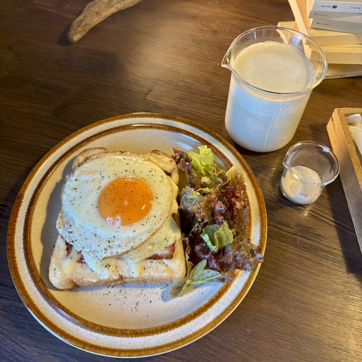 迷って筆者が注文したのはこちらのクロックマダム880円と焙じ茶ラテ700円。