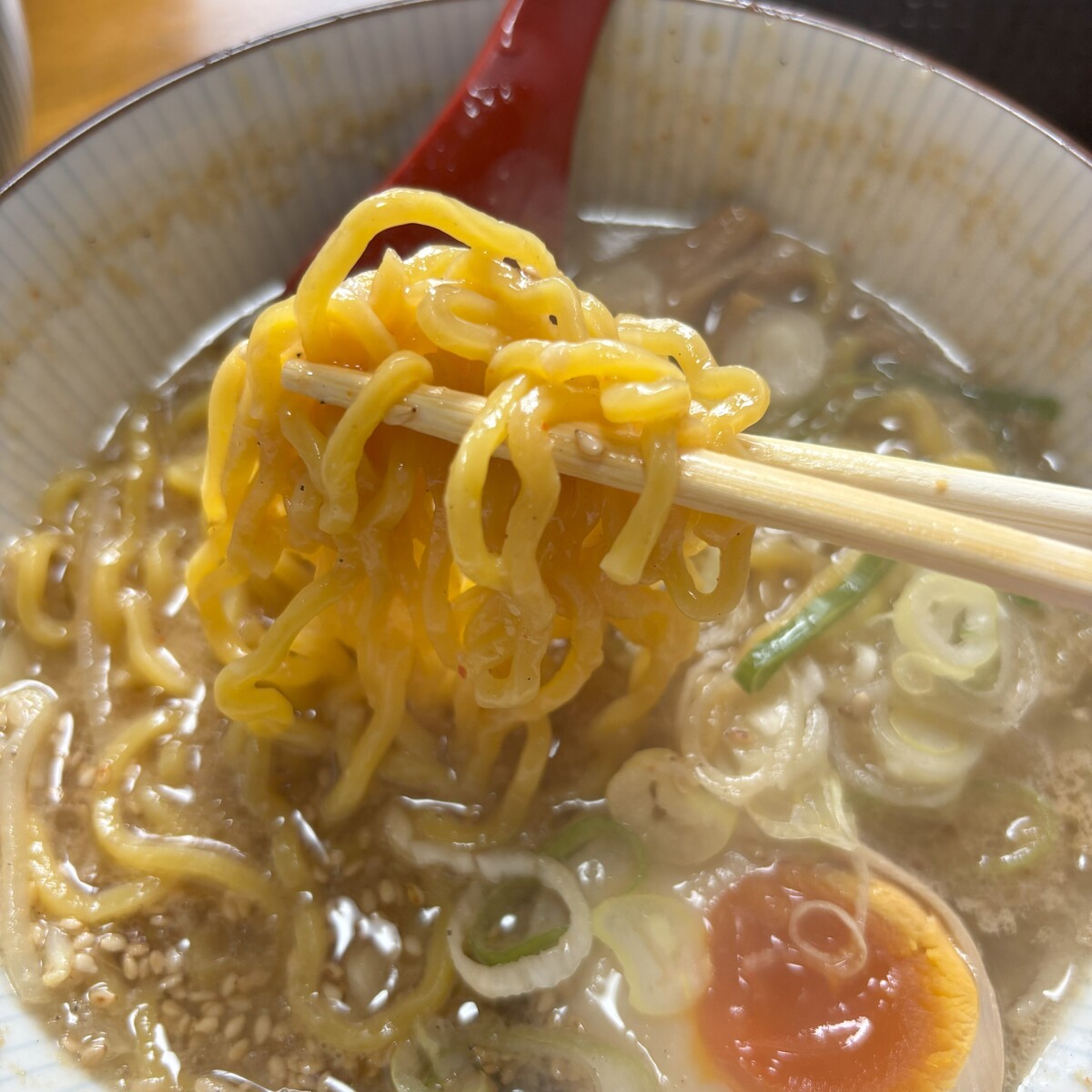 白味噌のまろやかさに背脂の甘み、とんこつの深いコクが重なり合って、スープをすくった瞬間に“旨みの層”が見えるような濃厚さです。