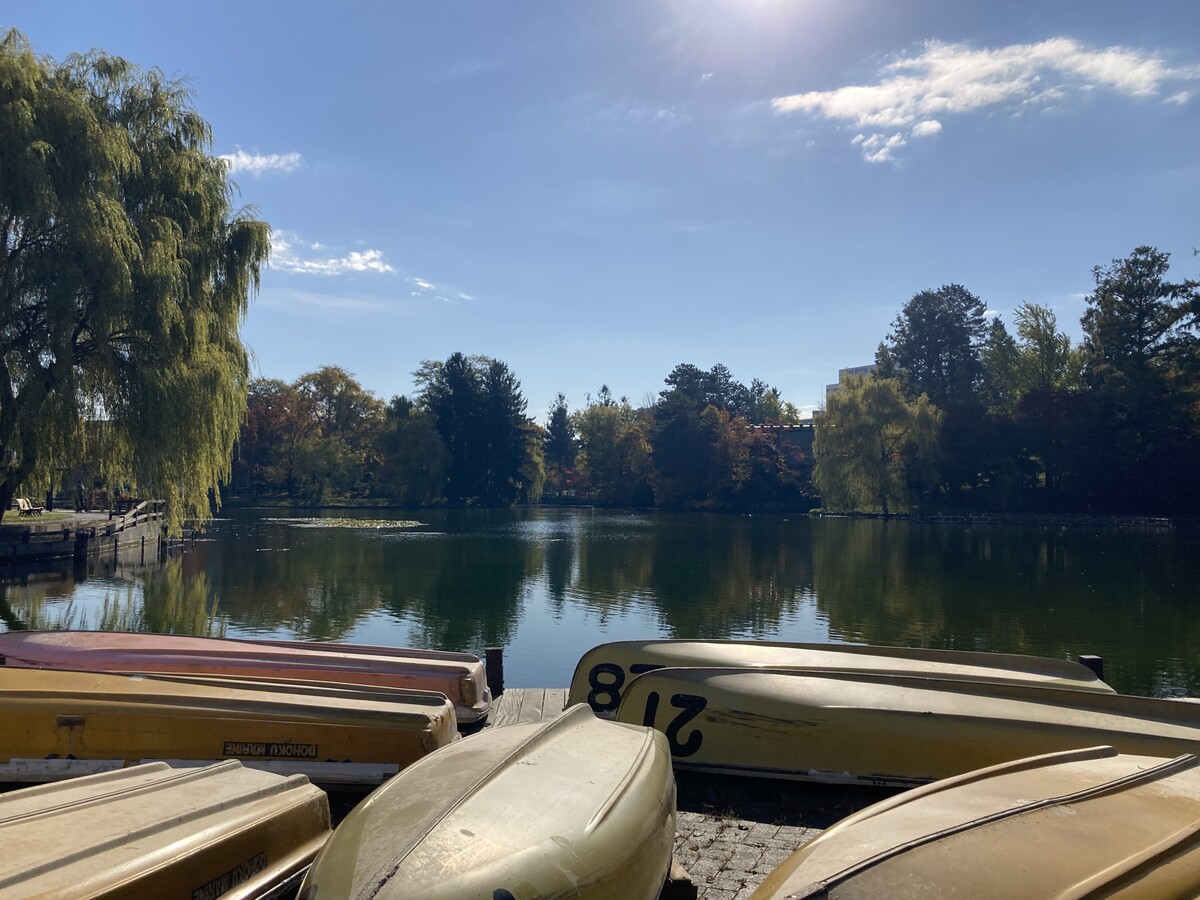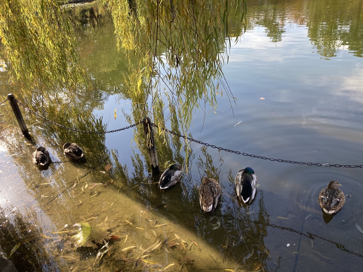 池の隅では鴨たちが仲良くお休み中。そっと横を通り過ぎると、穏やかな時間が流れていきます。