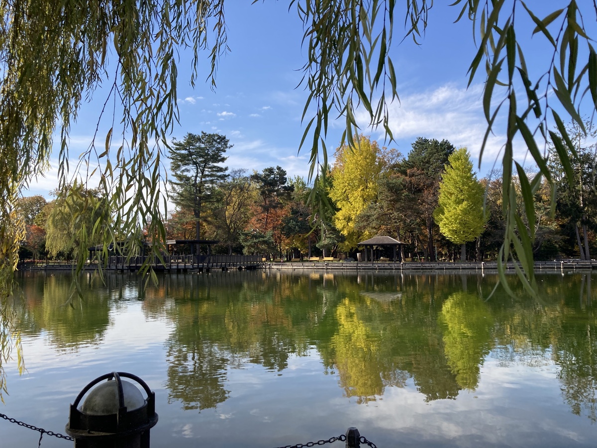 池の周囲をぐるっと歩くと、木々が水面に映り込み、静かな秋の景色を楽しめます。