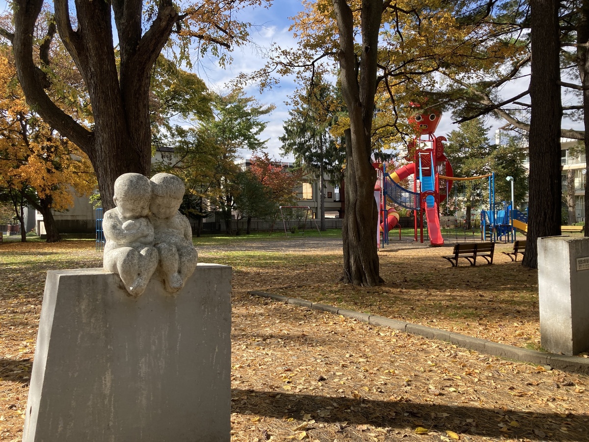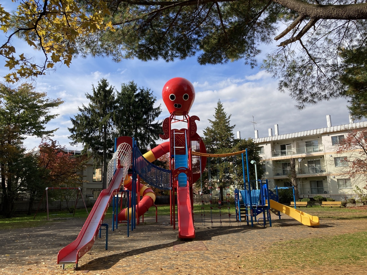 園内の北海道立旭川美術館の横にある「遊戯広場」には、常磐公園名物のタコの滑り台があります。