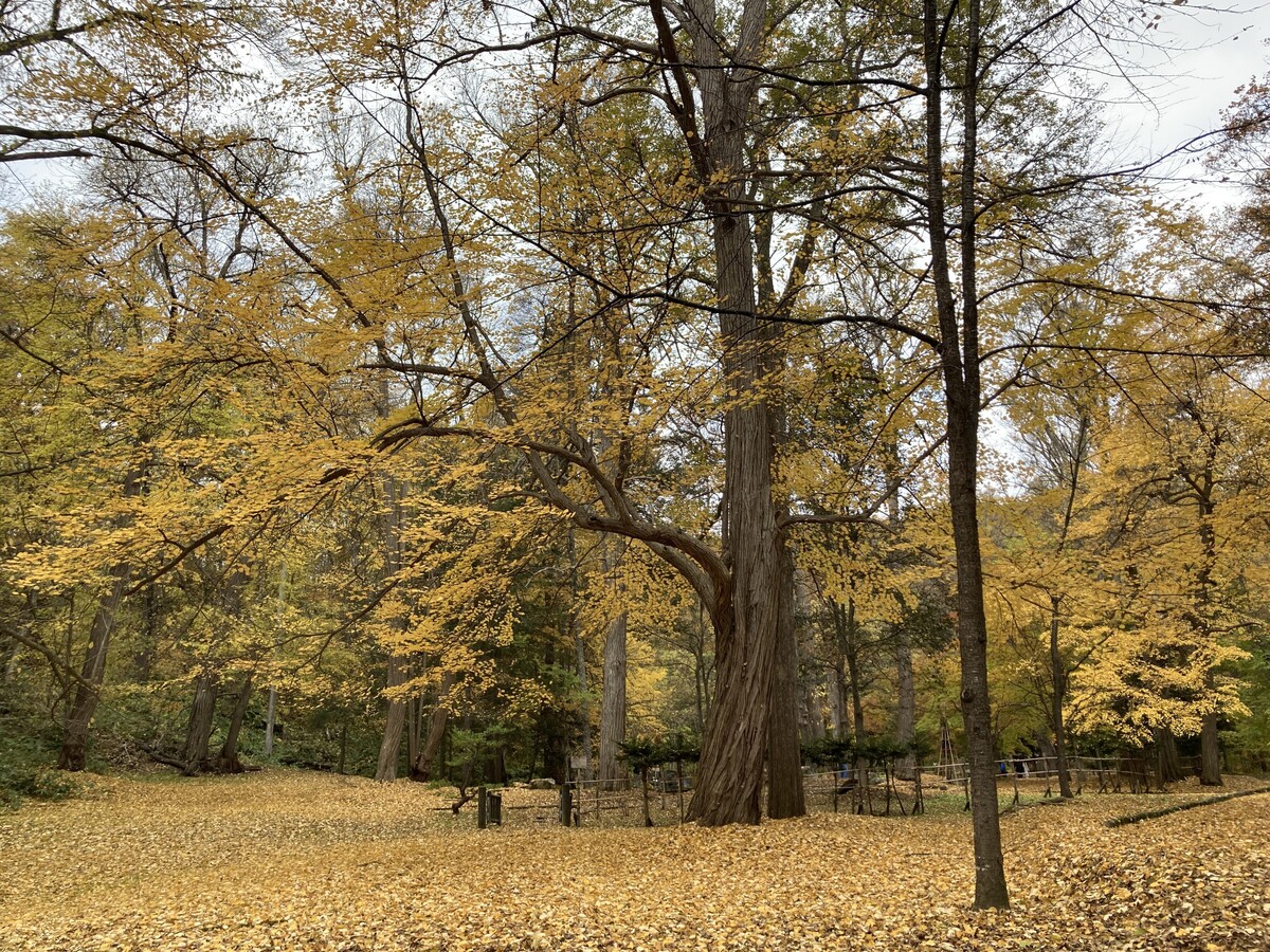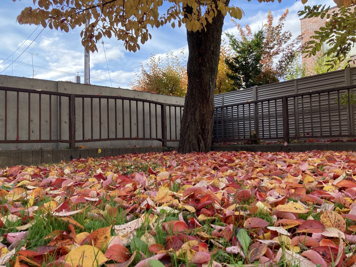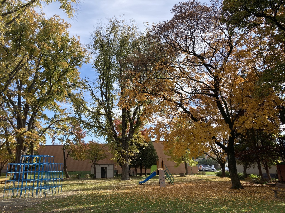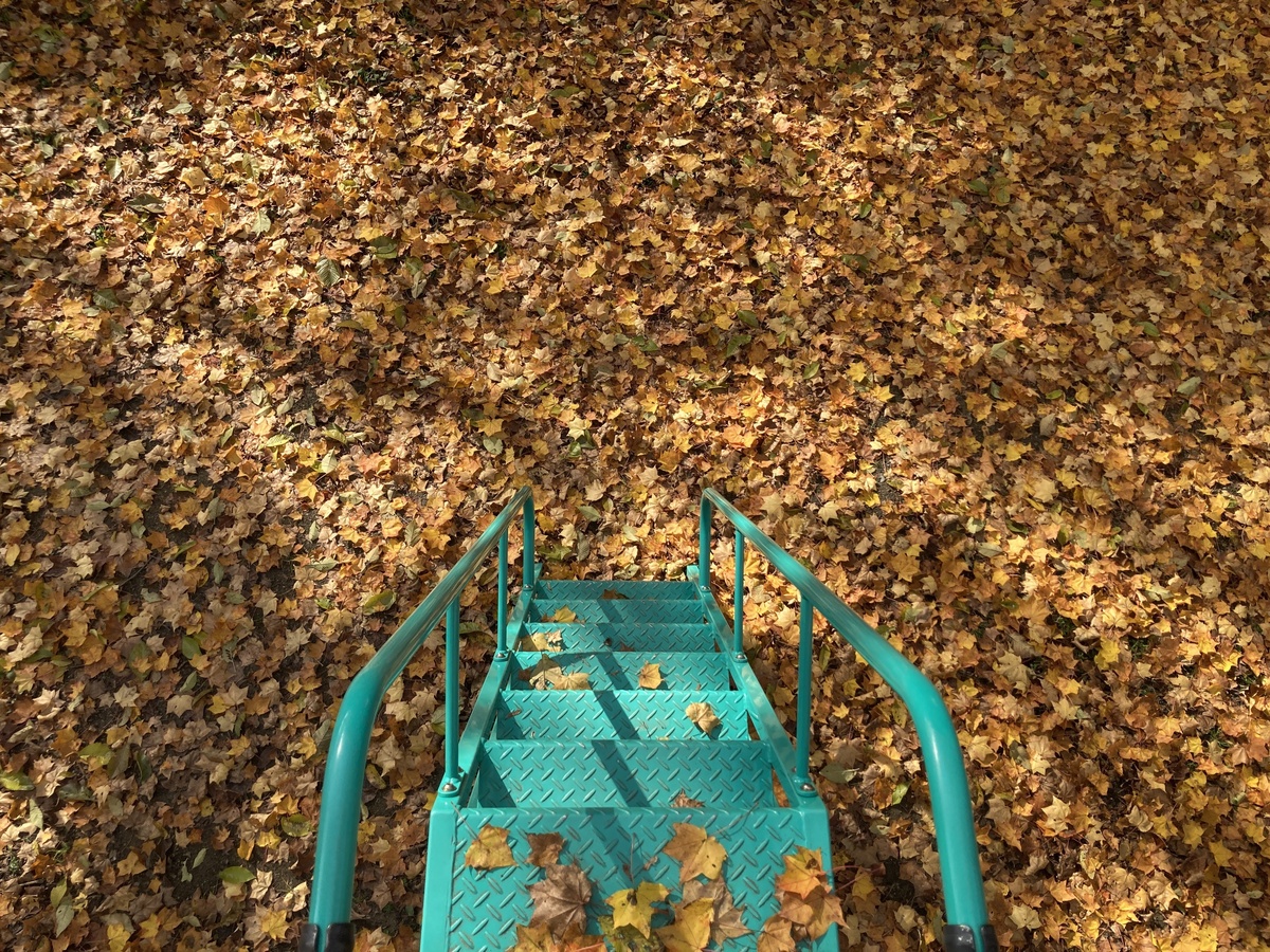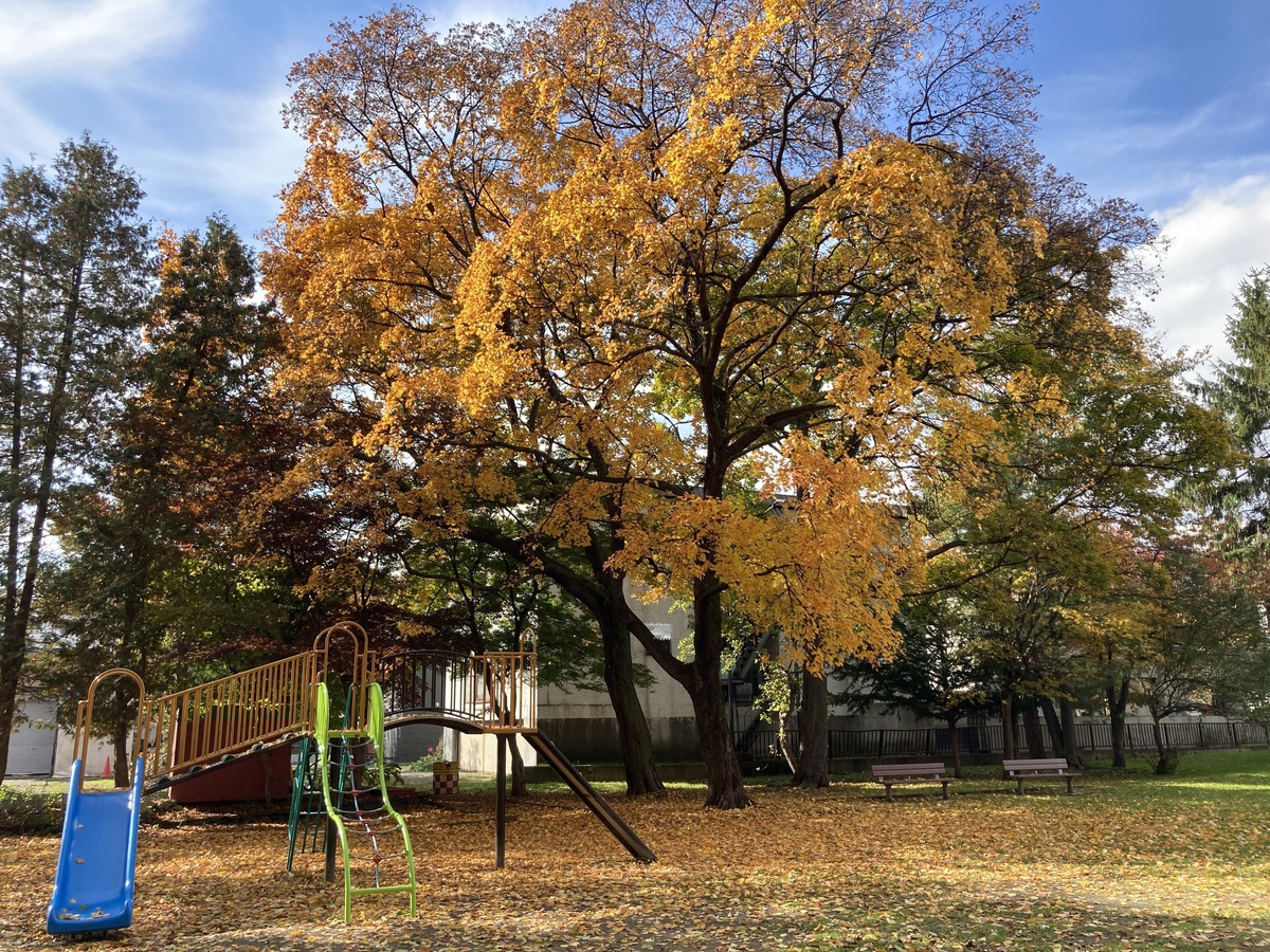 小さな滑り台の周りには黄色いカエデの木もあり、上から見下ろすと落ち葉のじゅうたんに飛び込みたくなるよう。