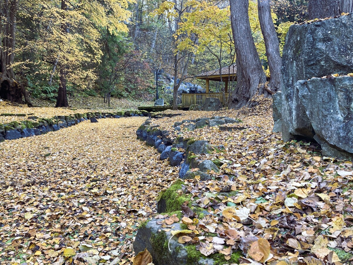 それでも枯れた水路を覆う落ち葉が、赤や黄色の川のようで、しっとりとした風情が漂っていました。