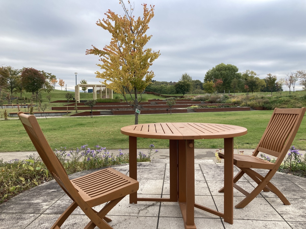 近くの「神人の森」エリアにはベンチやテーブルがあり、紅葉を眺めながらのんびり過ごすのにぴったりです。