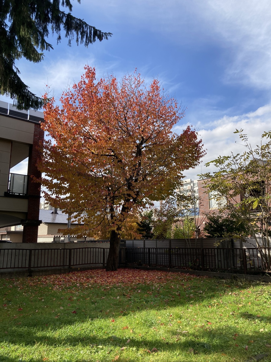 タコさんの背後に立つエゾヤマザクラが赤や黄色に色づき、芝生の緑とのコントラストがとても美しく映えます。