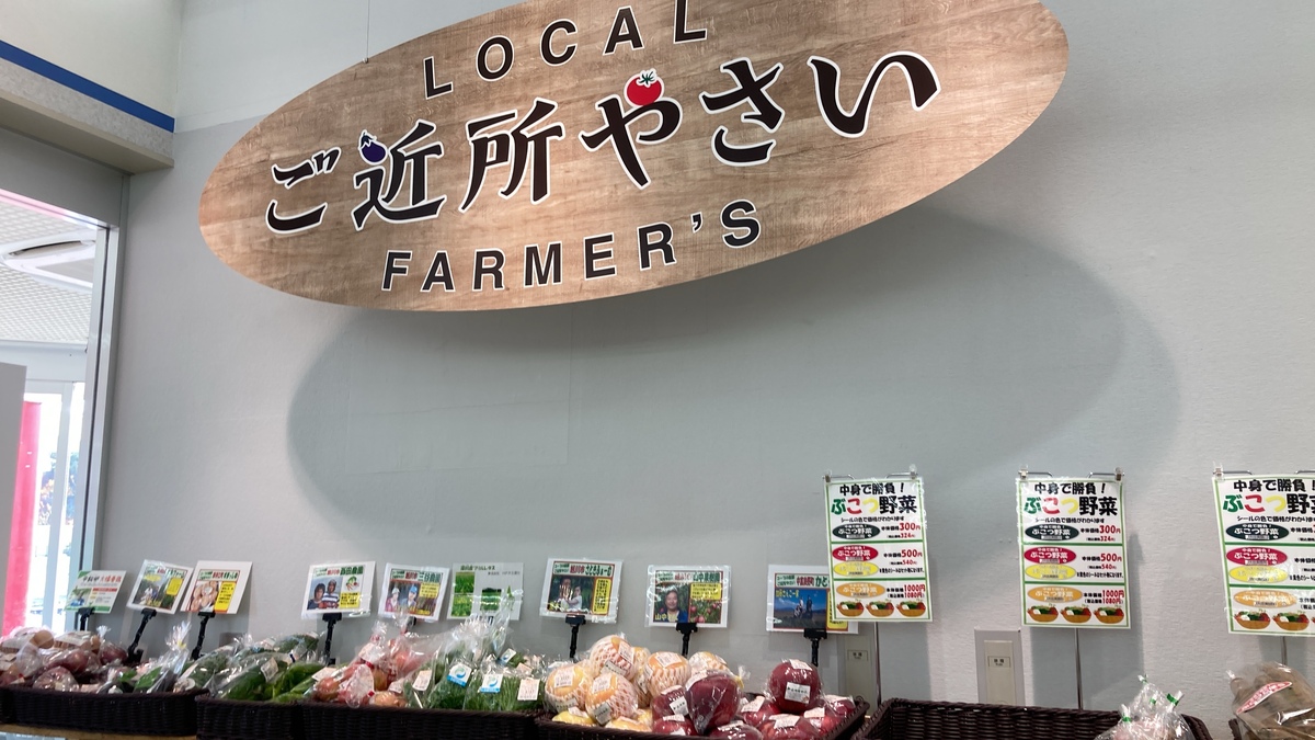 店内に入るとまず目に飛び込んでくるのが、地元野菜が並ぶ「ご近所やさいコーナー」。