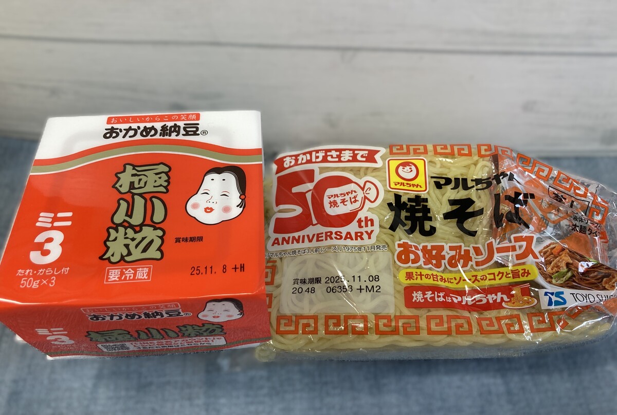 おかめ納豆(税込75円)やマルちゃんの焼きそば(税込171円)など、セール品も多く並んでいました。