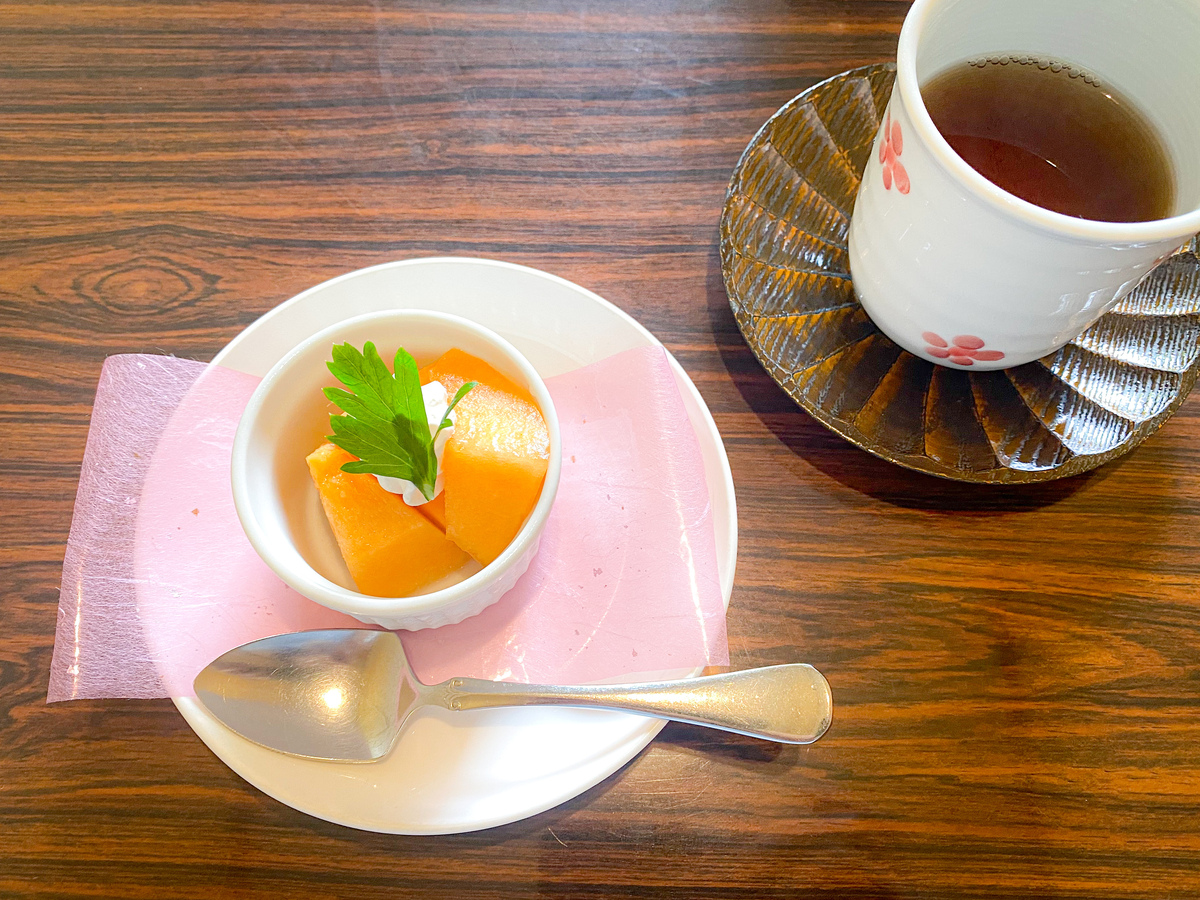 この日のデザートはメロン。デザートのときに、温かいお茶に取り替えてくれました。