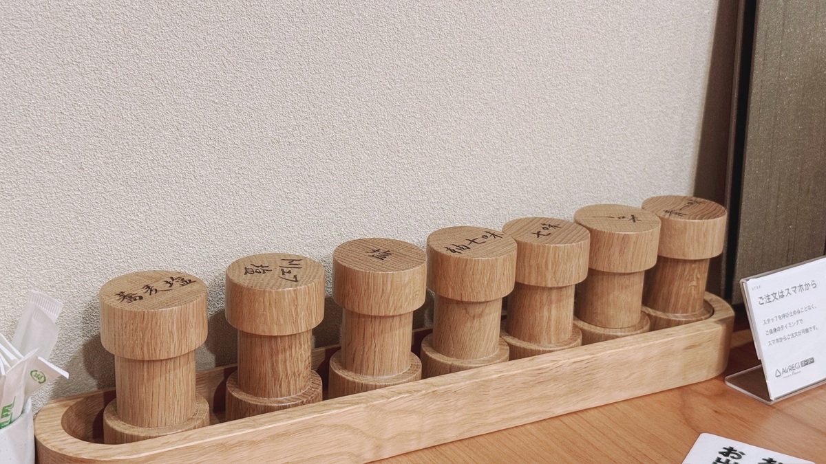 テーブルには薬味が並んでいて、個人的には牡蠣蕎麦には柚七味がとっても合うので美味しかった!