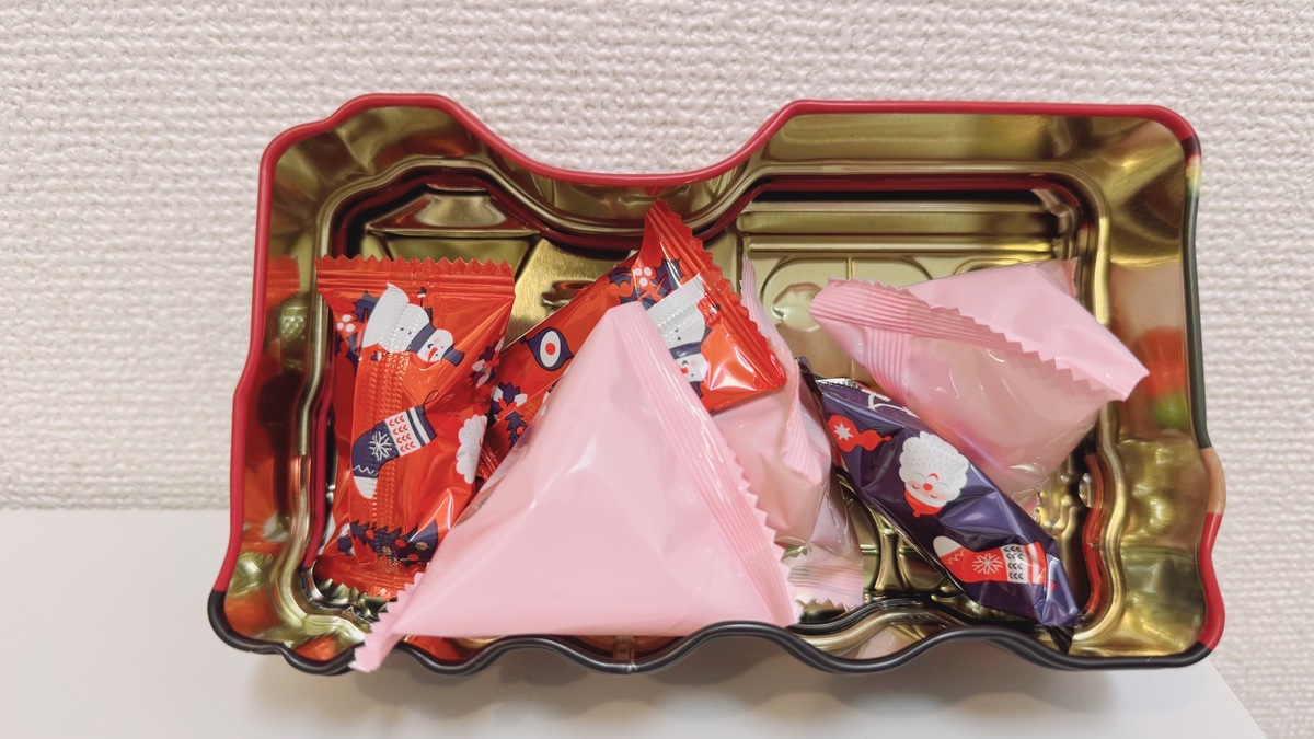 お菓子は少なめですが、缶のデザインがとても細かく毎年部屋に飾りたくなる雰囲気だったのが気に入っています。