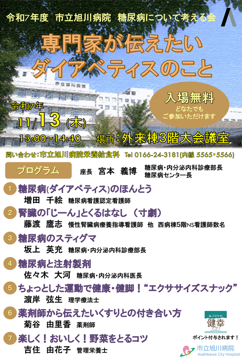 2025年11月13日(木)に市立旭川病院で『専門家が伝えたい ダイアベティスのこと』が開催されます。