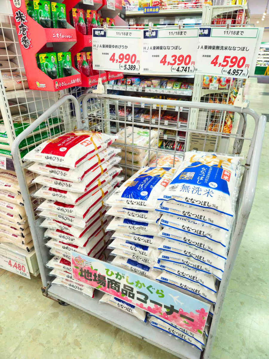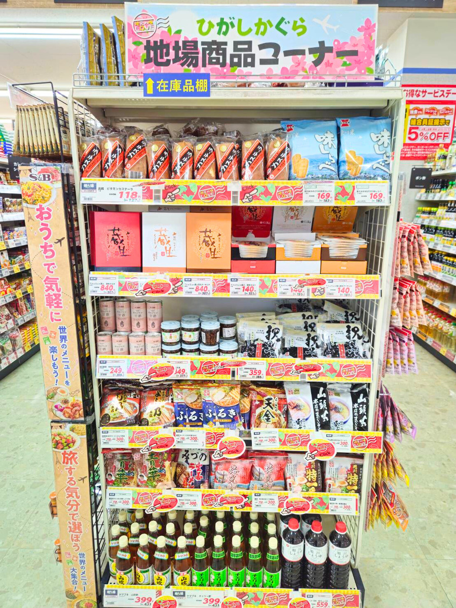 『ひがしかぐら地場商品コーナー』には地元の銘菓やインスタントラーメンなどが多数ラインナップ。
