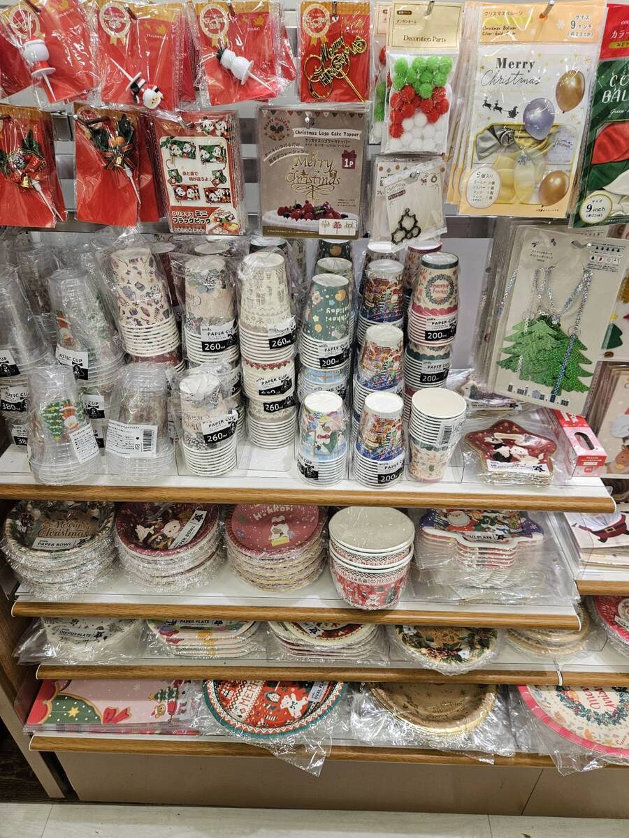 オーナメントや雑貨を中心に、食事用のお皿やコップなども豊富に揃うセリア。