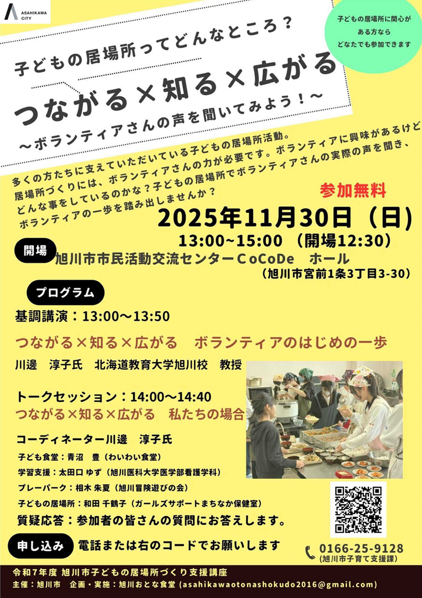 2025年11月30日(日)に旭川市市民活動交流センターCoCoDeで『子どもの居場所ってどんなところ? つながる×知る×広がる~ボランティアさんの声を聞いてみよう!~』が開催されます。
